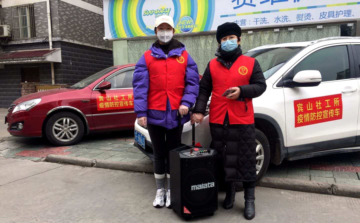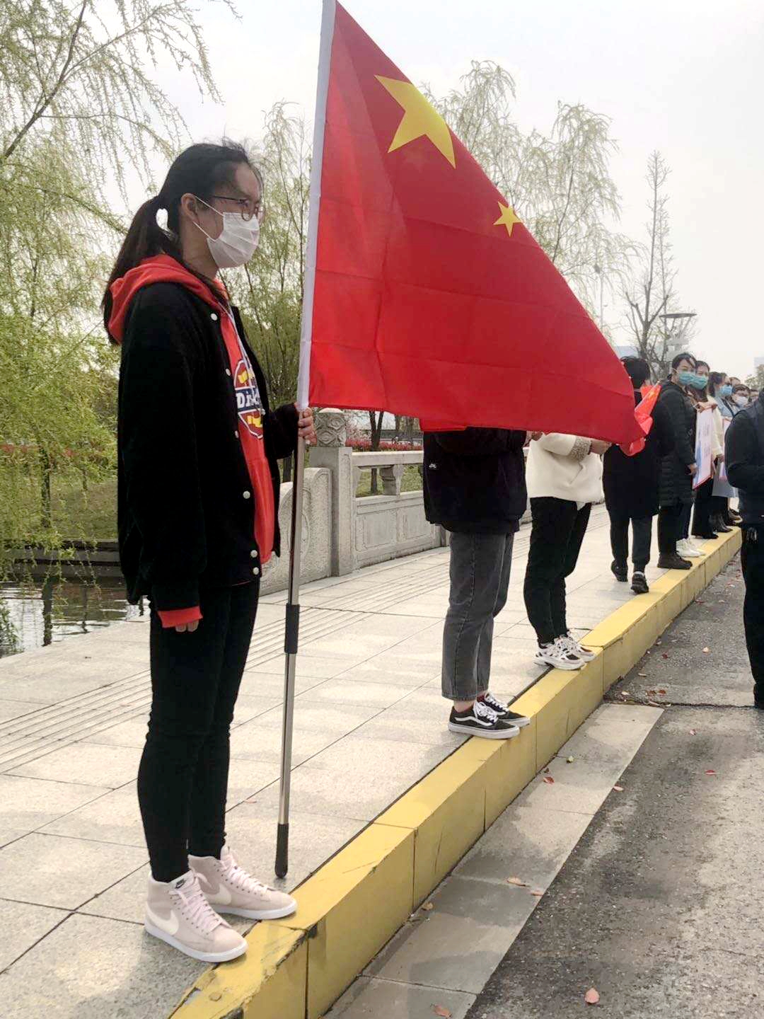 受表彰代表建筑工程系薛花蕊同学(左)在街上宣传防疫知识