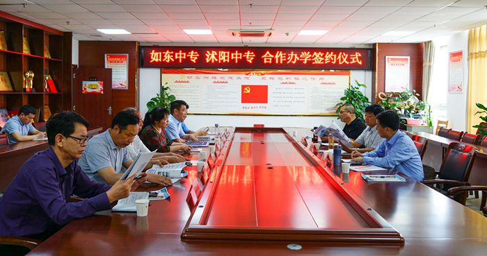 签约前,双方就协议内容进行再次磋商。如东中专曹卫民主任对协议中的合作办学模式进行了解读。这次合作,涉及机电技术应用、计算机应用两个专业,采取“1+2”、“2 + 1”、“3+0”三种办学模式。“1+2”合作办学模式,学生第一年在沭阳中专就读,学习文化知识及专业基础,第二年开始到如东中专就读,学习专业课程及进行技能训练,顶岗实习、就业等由如东中专负责安排;“2 + 1”合作办学模式,即学生在沭阳中专学习2年的文化课、专业基础课和部分专业课,后1年到如东中专进行专业课教学实习和顶岗实习,学生毕业后由如东中专负责安置学生就业以及就业后服务;“3+0”办学模式,即学生全程在沭阳中专就读,两年半后的顶岗实习和三年后的就业由如东中专安排到如东企业工作。