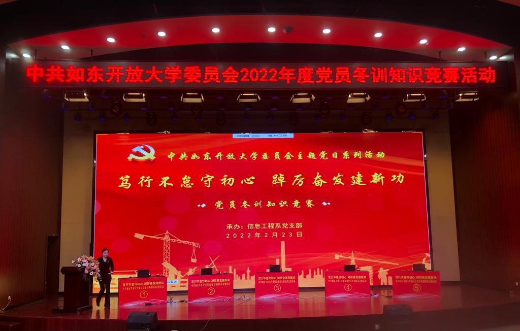 2月23下午,中共如东开放大学党委会第四次“主题党日+”暨2022年党员冬训特色活动在学校敬德堂举行。本次活动由信息工程系党支部承办,主题为“笃行不怠守初心 踔厉奋发建新功”。校党委书记余飞,党委委员曹峰、孙智明、曹卫民、陈建、肖海兵、唐晓云及学校全体党员同志、信息工程系全体学生参加了活动。