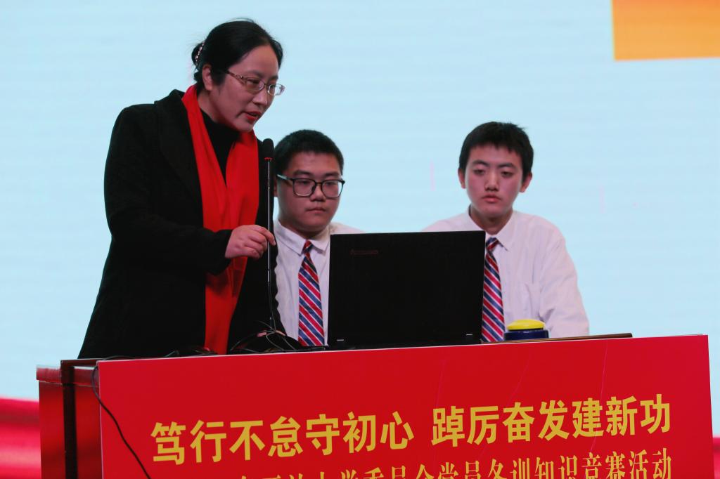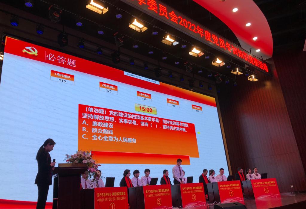 本次知识竞赛分台上参赛队比拼和台下党员竞赛。台上15人,分五支代表队,由选派的党员教师、入党积极分子和先进学生代表组成,经必答题、抢答题和风险题三轮,总积分高出的代表队获胜,如台上选手答题错误则由台下党员助力答题;台下全体党员130多人,采用手机互动答题,以得分和提交速度为评判标准,排名靠前者获胜。竞赛内容涵盖习近平新时代中国特色社会主义思想、党的十九届六中全会精神、党史知识、省市县党代会精神以及我校相关知识等七大方面的特色内容。