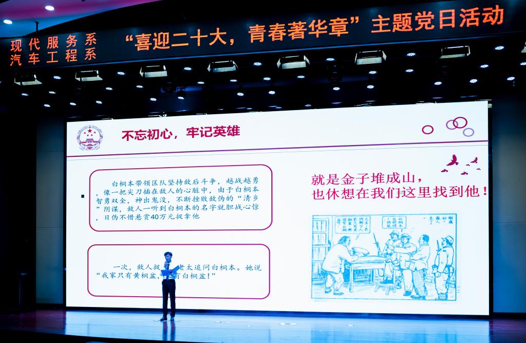 汽车工程系学生代表为大家讲述了革命烈士白桐本的英雄故事,烈士对党和国家无限忠诚的感人事迹让现场党员们无不深受触动。