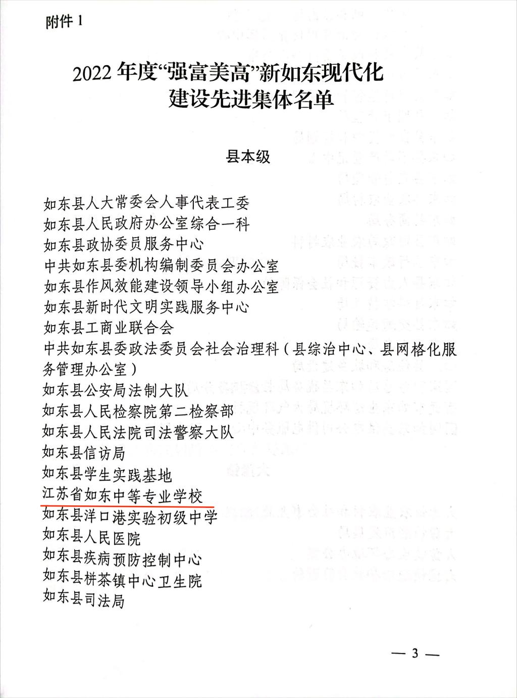 为进一步弘扬先进、激励队伍、激发活力,日前县委、县政府下发了《关于表彰2022年度“强富美高”新如东现代化建设先进集体和先进个人的决定》,对100个先进集体,200名先进个人予以表彰奖励,我校被授予2022年度“强富美高”新如东现代化建设先进集体。这是县委、县政府以及社会各界对我校服务地方经济发展、助力强县富民所做出贡献的充分肯定。