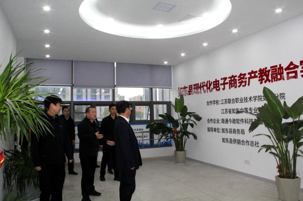 10月21日下午,县人大常委会主任蒋树建率队到如东中专,就电子商务产教融合实践中心建设情况进行专题调研。如东中专副校长肖海兵、花金明,党委委员祁勇,党政办主任王海峰,合作企业南通今政软件科技有限公司总经理刘松柏、副总经理季红梅等陪同。