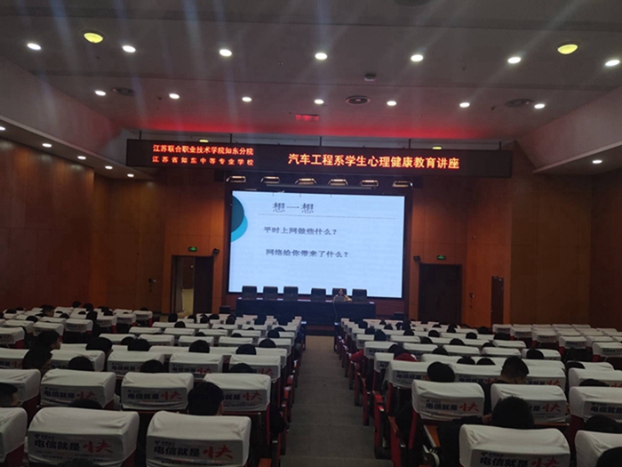 11 28日下午第二课,汽车工程系何恒建主任主持,学工处崔宁琳老师给全体学生上了一堂以拒绝网瘾、健康成长为主题的心理健康教育讲座。