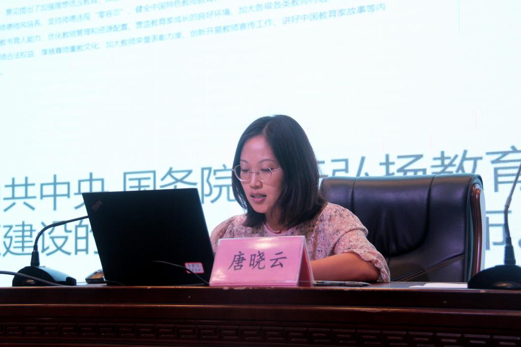 唐晓云副校长以《教育家精神时代内涵与职业教育的弘扬路径》为题从教育家精神内涵,职业教育弘扬教育家精神的路径两个方面对职业教育学校教师如何发扬新时代教育家精神进行了阐述。她认为,职业教育弘扬教育家精神要从政治品质,职业准则,职业素养,职业发展,职业境界,职业理想等六个方面发力,才能将教育家精神内化于心,外化于行,成就有弘道追求的新时代“四有”好老师。
